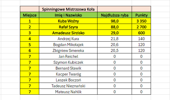 W dniu 09.06.2024 na zbiornikach nr 604 Łęg odbyły się zawody o tytuł Mistrza Koła w dyscyplinie spinningowej. Zawody rozegrano w jednej, 5-godzinnej turze z udziałem trzynastu zawodników, z których sześciu złowiło ryby zaliczane do klasyfikacji. Tytuł Mistrza Koła na rok 2024 przypadł Kubie Woźnemu, który zdobył 3 350 punktów, łowiąc szczupaka mierzącego 98 cm. Na drugim miejscu z tytułem I-go V-ce Mistrza Koła znalazł się Rafał Szyra, który złowił szczupaka o długości 88 cm (2 700 punktów). Podium na trzecim miejscu uzupełnił Amadeusz Sirzisko, który złowił Okonia mierzącego 29 cm (600 punktów).