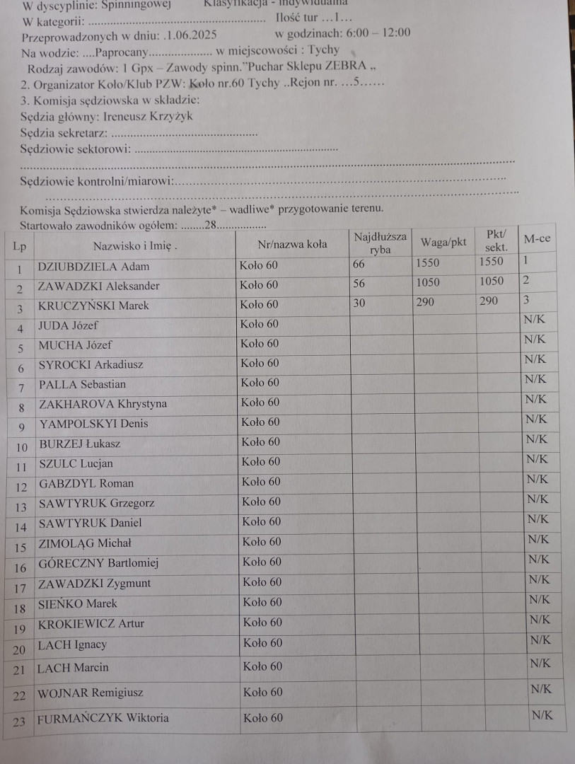 🎣 Wyniki zawodów: